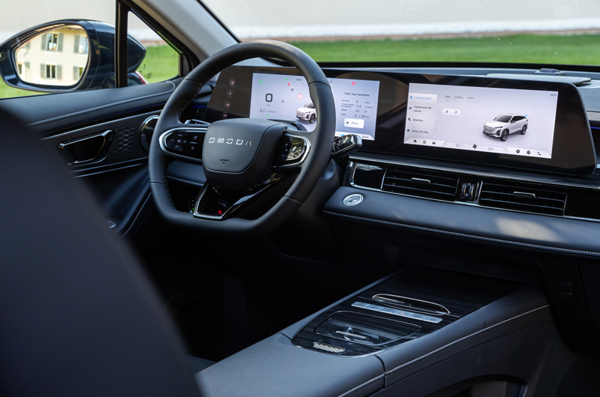 Интериорът на Omoda 5 е силно дигитализиран и следва актуалните тенденции. Двата големи дисплея (табло и инфотеймънт) са основен фокус, а общото усещане е по-близо до по-висок клас автомобили. Пространството е достатъчно за ежедневна и семейна употреба, макар моделът да остава компактен по размери.