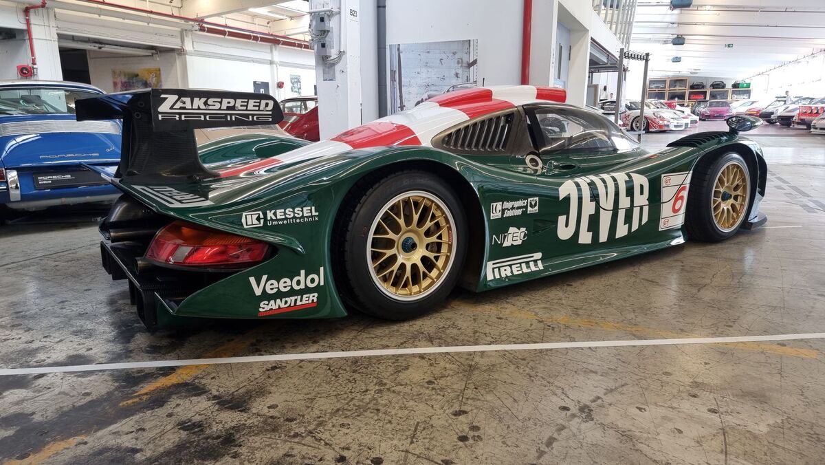 Да, с това само започнахме и трябваше бързо да обиколим, защото гонехме стриктен германски график. Но погледнахме и вляво и хоп - един от малкото състезателни екземпляри на един от може би най-впечатляващите автомобили на компанията - 911 GT1, а този екземпляр обикаля по световните писти през 1998 година.