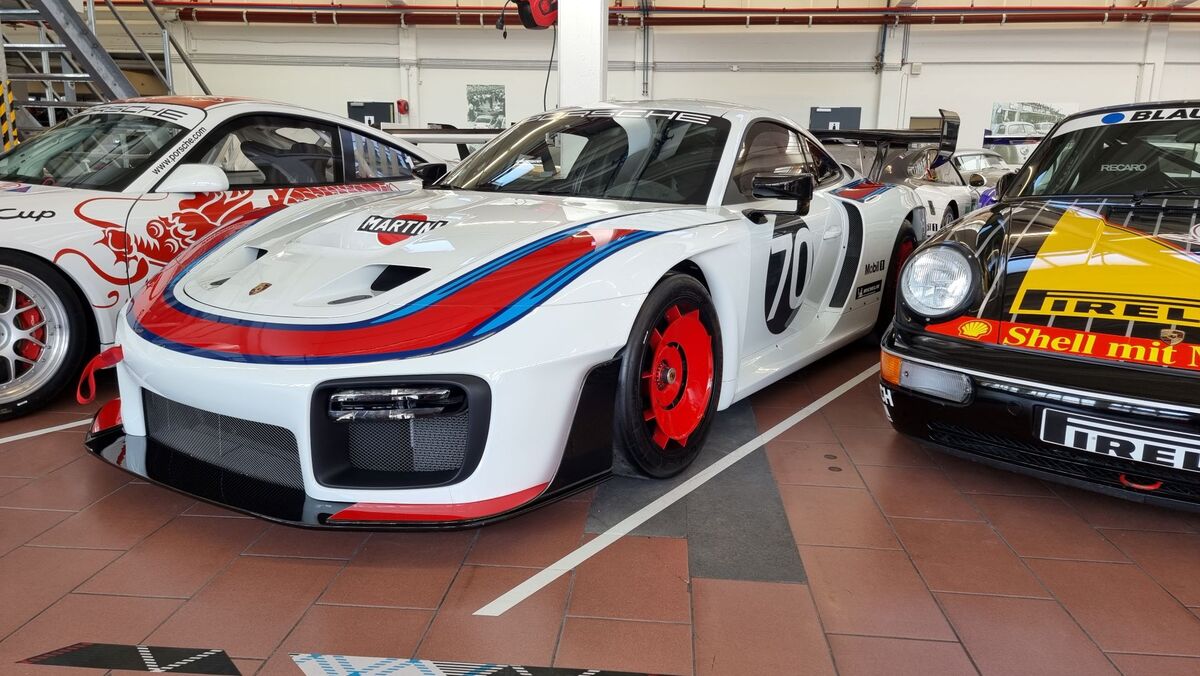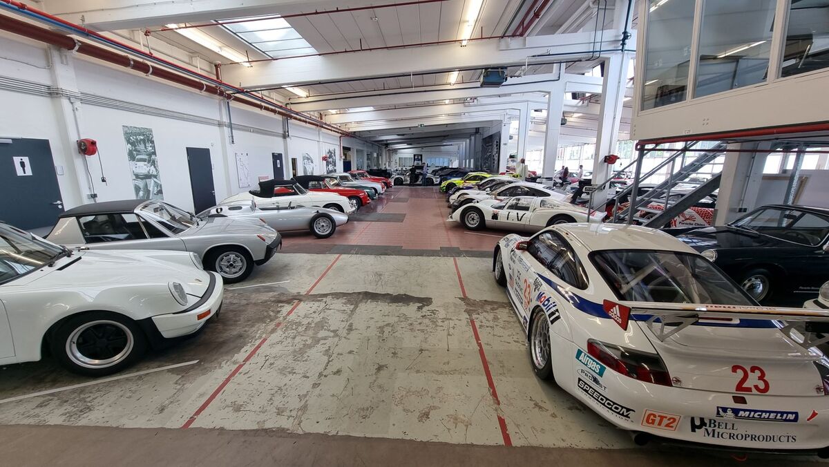 Вдясно обаче, освен версии на първия модел на компанията 356, виждаме в дъното доста на брой модерни състезателни автомобили - "911" във версиите Cup, R, RSR, GT3, GTE, GT1, както и прототипи като "962" и открити "барчета" болиди.