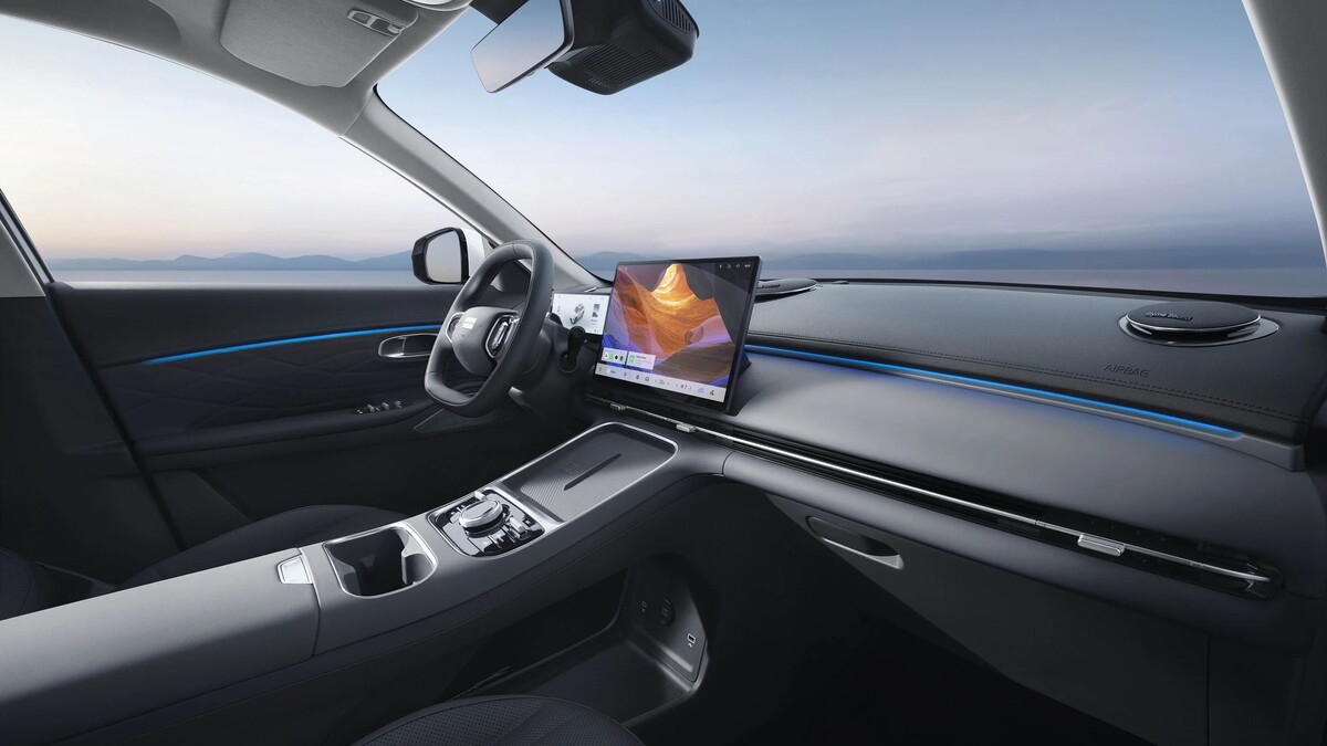 В най-общи линии казаните по-горе думи важат в същата сила и за вътрешността на автомобила, която е просторна, сравнително качествено направена и добре оборудвана, но не се отличава с нещо особено нито на фона на конкуренцията, нито спрямо останалите модели на конзерна Geely - атмосферата се доминира от голям сензорен екран, монтиран вободно в средата на таблото, а на издигнатата централна конзола имаме безжично зареждане на смартфон в предната част и все пак няколко физически бутона по-назад, предназначени за командване на климатичната инсталация, а между тях и подлакътника са позиционирани поставките за чаши и бутилки - от ергономична гледна точка, въпросните са разположени твърде назад и твърде високо, за да бъдат наистина удобни. Иначе картината е добре позната от почти всеки не се отличава от всеки друг съвременен китайски модел от подобна категория - относително добре изглеждащи на вид и допир меки пластмаси, вентилационни отвори и бутони за прозорците, които вече сме виждали и при други марки, както и на моменти доста отвличащо вниманието на водаа от трафика управление на функциите през тъчскрийна. Две от нещата, които наистина вероятно биха ви "изкефили" на борда на Geely Starray EM-i, са панорамния покрив, който впечатлява както с площта, така и с оптималното си разположение и радва в еднаква степен седящите на двата реда седалки (и за разлика от редица конкуренти, разполага с наистина солидна и непропускаща светлина и топлина защитна ролетна щора), както и неочаквано добре звучащава аудиосистема FLYME SOUND с общо 16 високоговорителя, два от които са разположени в предните подглавници.