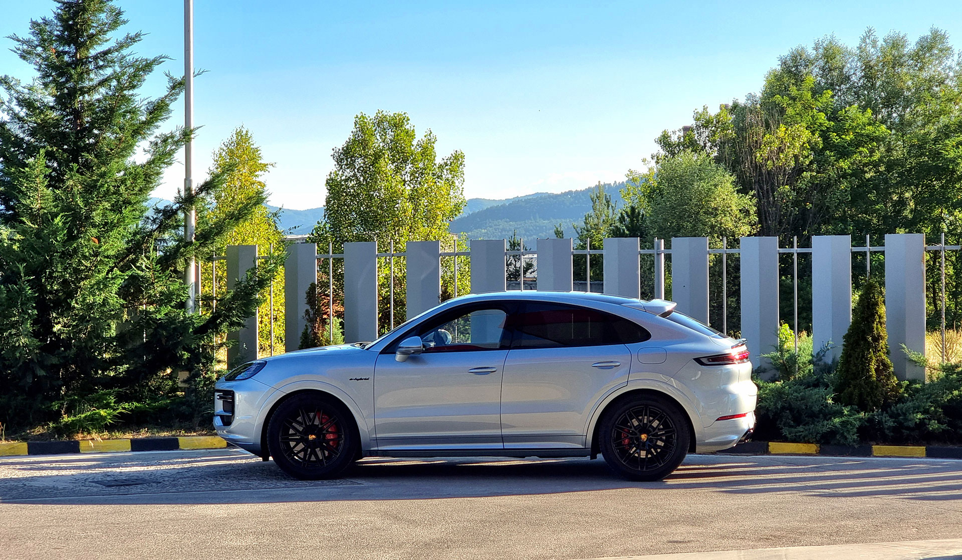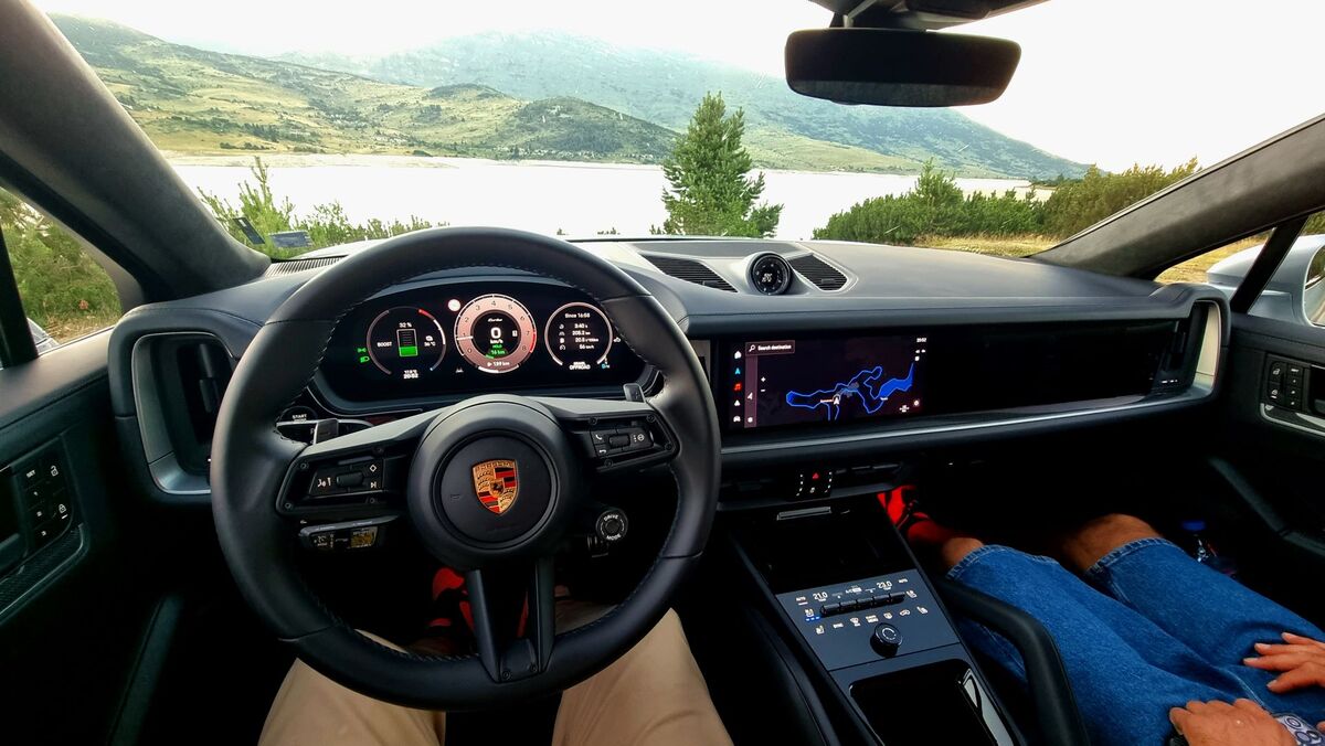 Отвън: Turbo E-Hybrid по никакъв начин не показва на какво е способен с външността си - да, това е нещо като американското определение "слийпър" и съответно "вълк в овча кожа" по нашите земи. Няма крещящи аеро детайли, няма крещящи надписи, няма и фамозни джанти, няма го дори и активния заден спойлер като при Turbo GT. Само един доста малък надпис Cayenne Turbo в задната част и дна още по-малки e-hybrid в задната част на предните калници - повече от семпло - нищо не говори за 739 конски сили, освен спирачките с карбидни дискове, които са с размер от 410 мм отпред.