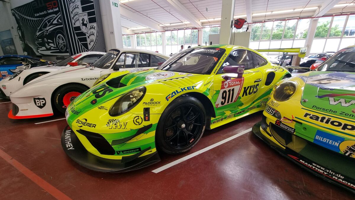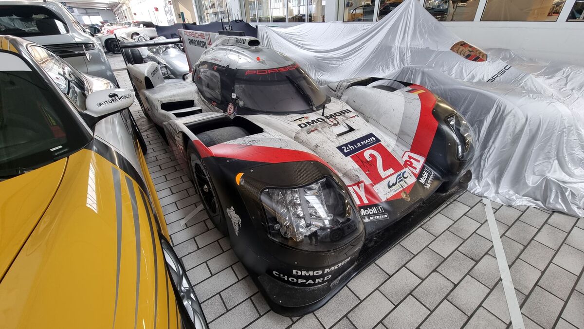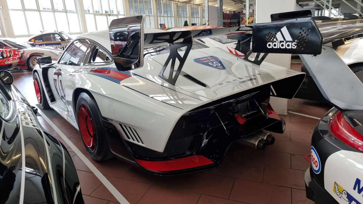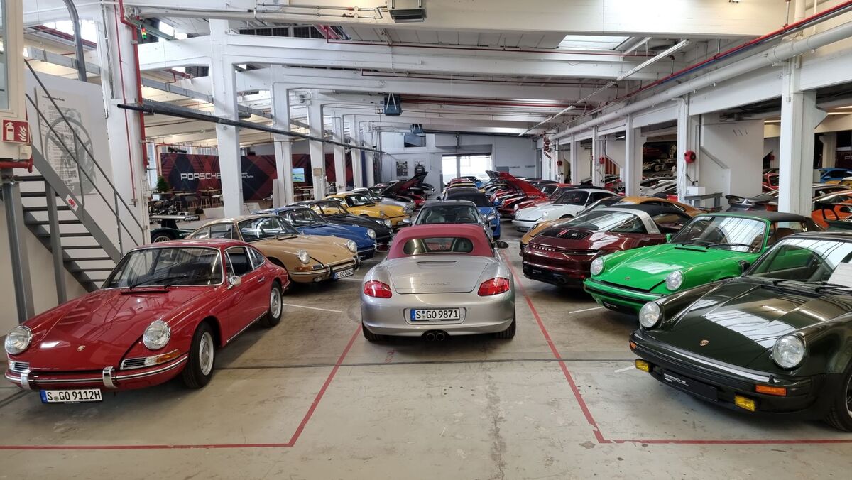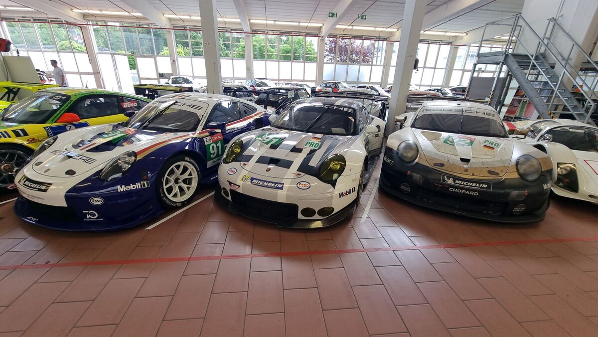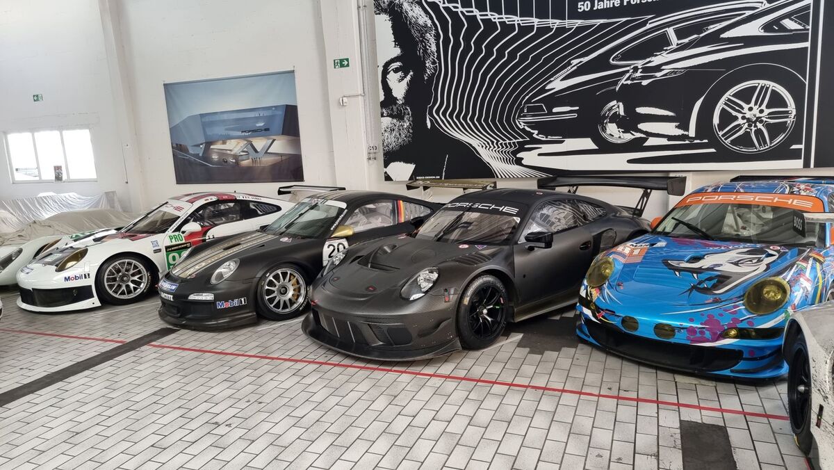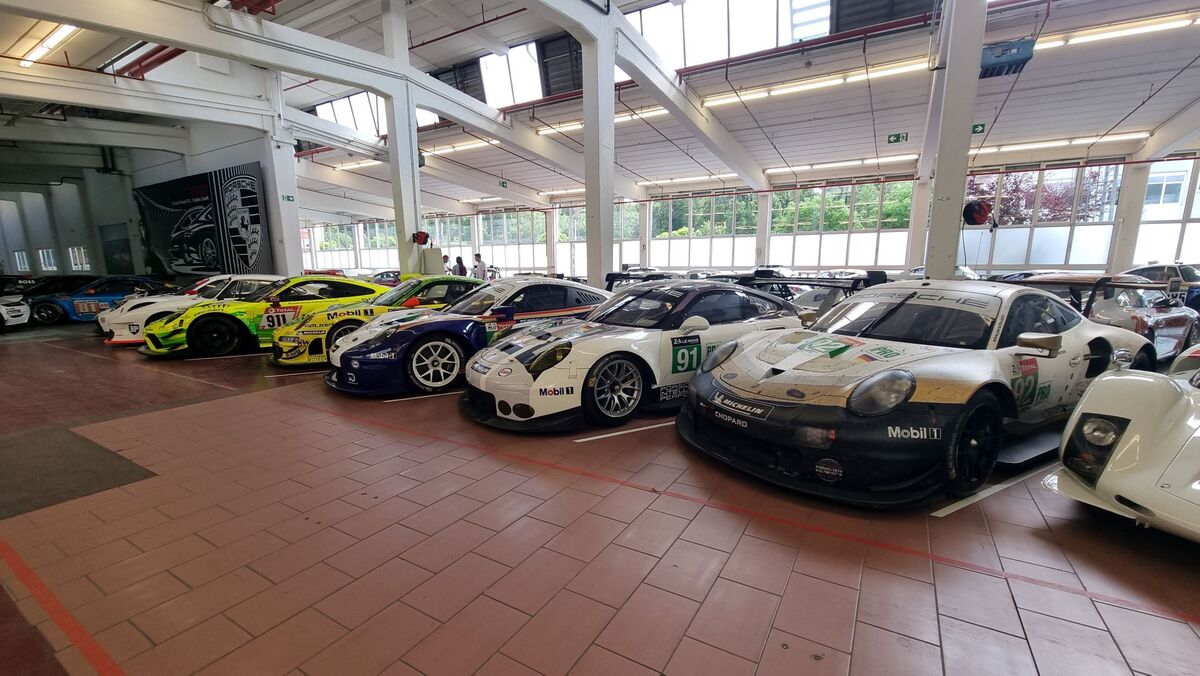 Вдясно обаче, освен версии на първия модел на компанията 356, виждаме в дъното доста на брой модерни състезателни автомобили - "911" във версиите Cup, R, RSR, GT3, GTE, GT1, както и прототипи като "962" и открити "барчета" болиди.