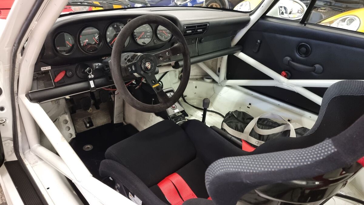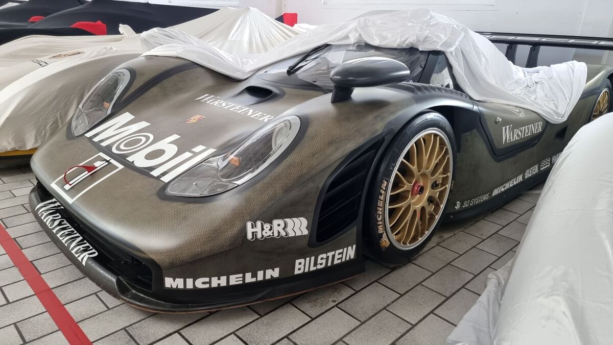 Първият състезателен екземпляр на 911 GT1, покрит само с бели надписи върху карбон-кевларените външни панели