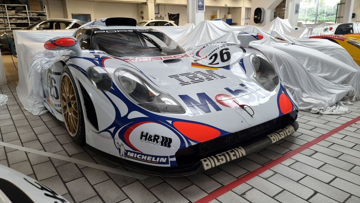 Да, с това само започнахме и трябваше бързо да обиколим, защото гонехме стриктен германски график. Но погледнахме и вляво и хоп - един от малкото състезателни екземпляри на един от може би най-впечатляващите автомобили на компанията - 911 GT1, а този екземпляр обикаля по световните писти през 1998 година.