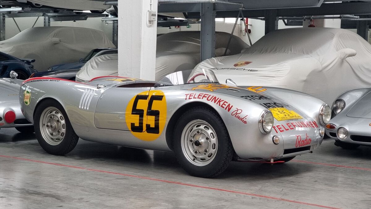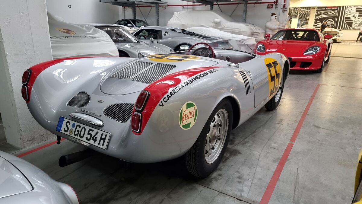 Отзад пък, седи коренът на Panamera и Carrera моделите - Porsche 550 Spyder, участвало в Carrera Panamericana - митичното рали в Мексико, провеждало се като състезание в началото на 50-те години, а сега вече ретро рали.